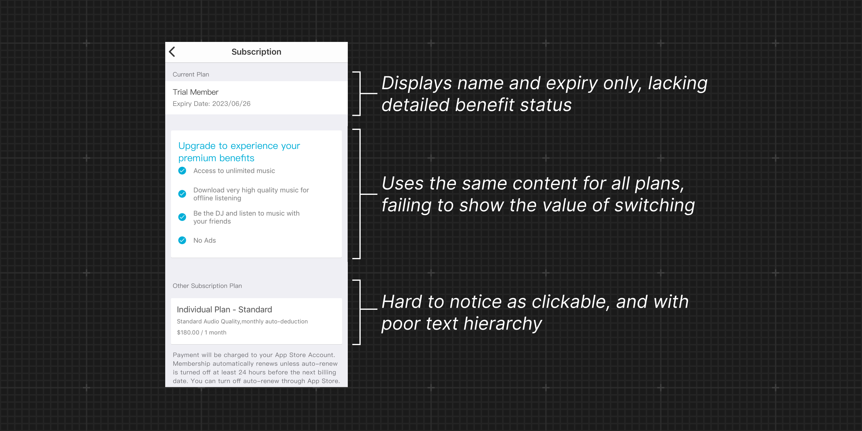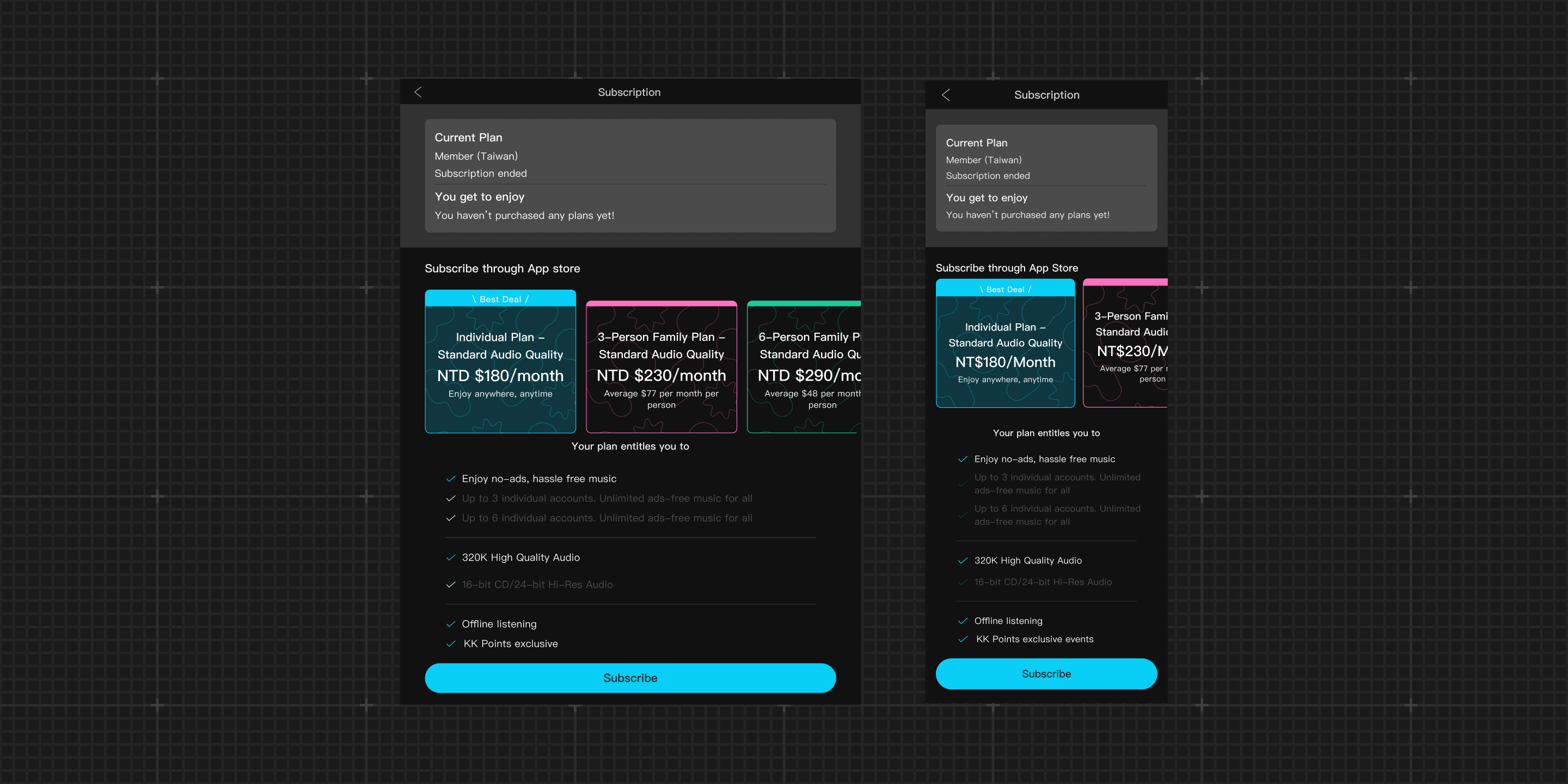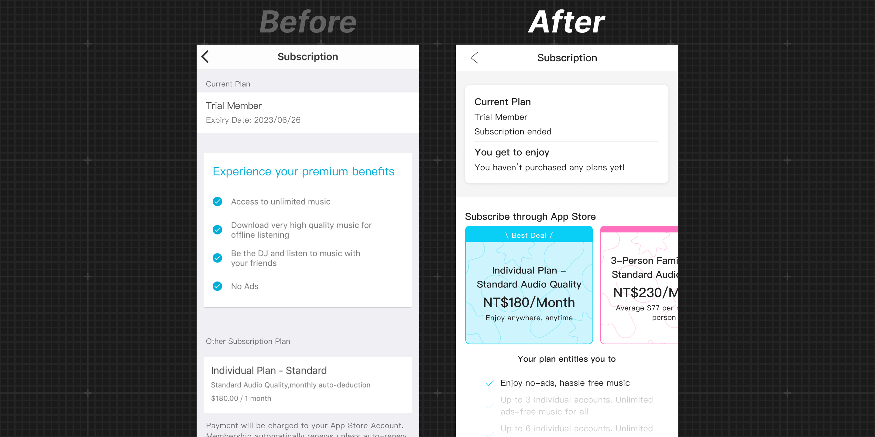 I redesigned the end-to-end subscription structure and interface to restore in-app conversion as a growth lever. The new experience increased purchase conversion by 3.8% and drove 2,000 new Family Plan subscribers per month.
