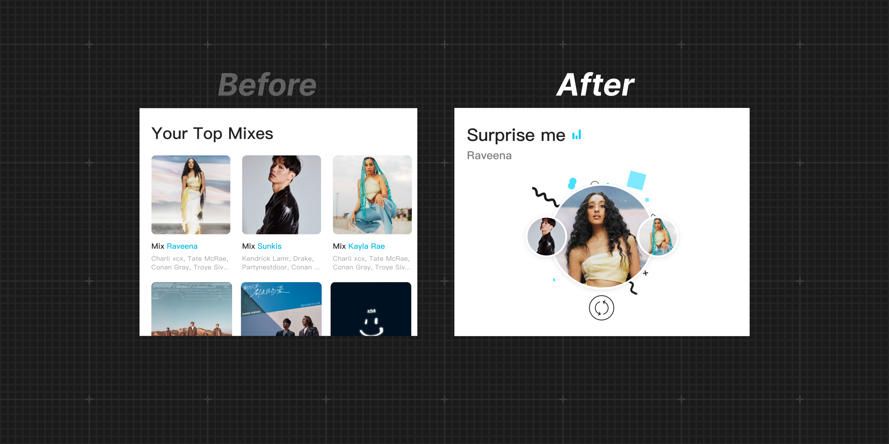 I led the 0–1 design of a motion-driven AI playlist experience that transformed a black-box recommendation into an experiential discovery journey. Post-launch surveys showed a 75% satisfaction rate, indicating strong early user reception.