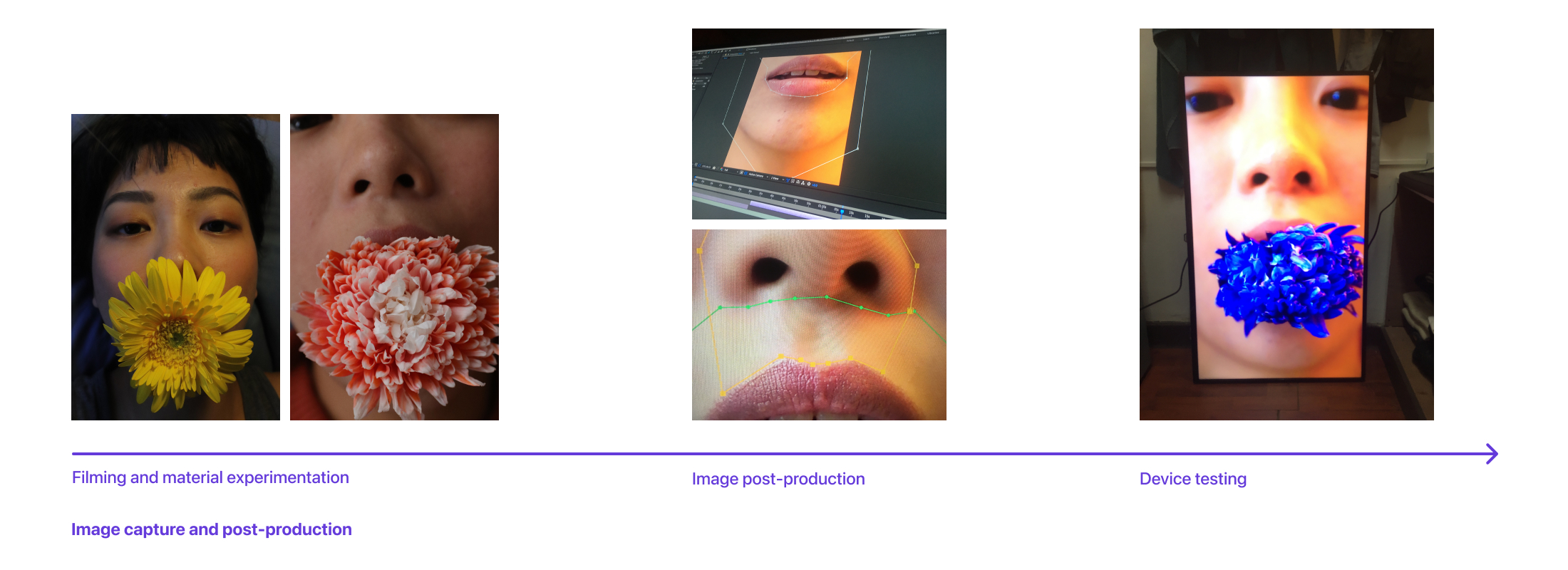 In 24 voice-over images, voice actors initially started with sounds or uncertainty in improvisational situations. As the voice acting process progresses, the story they described became clearer. Ultimately, when combined with images of flowers, these unique voiceovers found balance and created a new form of expression.